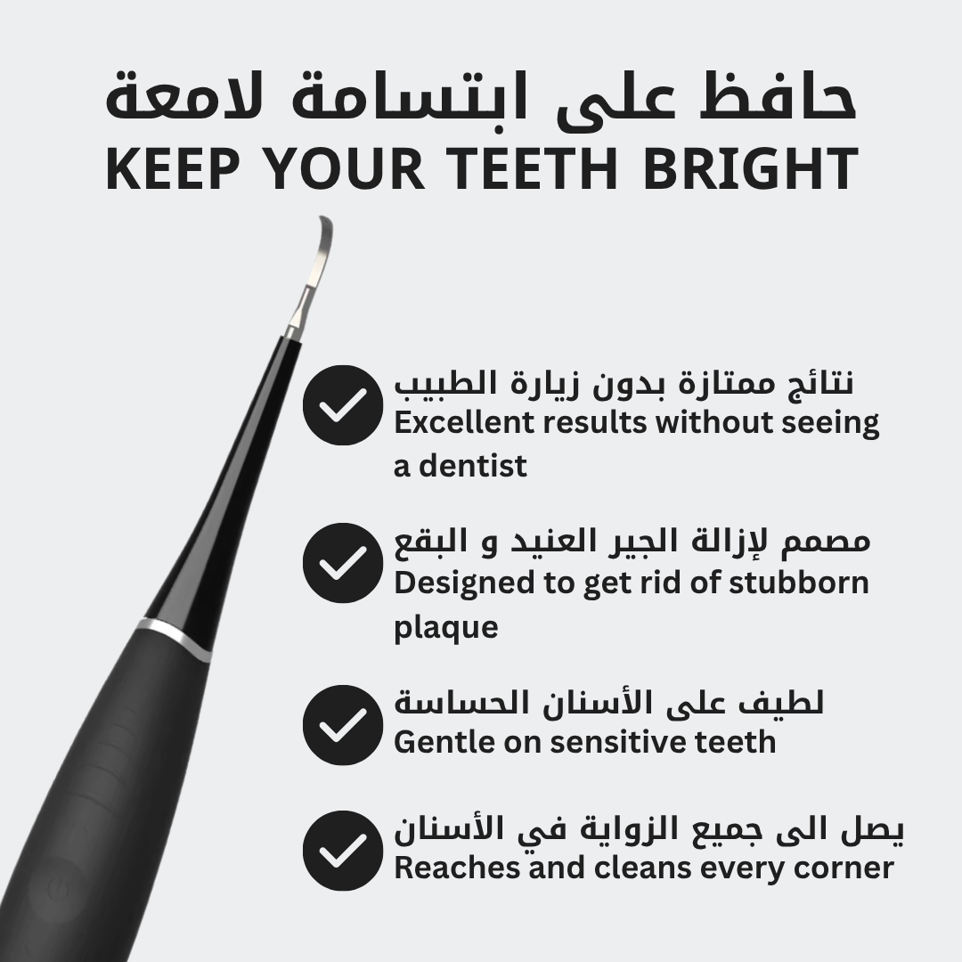 نضمن عدم وجود أي ألم. تعتمد تقنيتنا فوق الصوتية على اهتزازات لطيفة بتردد 42,000 هرتز، آمنة تمامًا على المينا واللثة. تُزيل البلاك دون خدش أو ضغط.